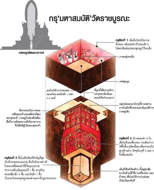 ภาพของมงกุฎทองคำในพิพิธ ภัณฑ์ ที่อยู่ในพิพิธภัณฑ์ อาเซียนอาร์ต สหรัฐอเมริกา ปรากฏออกมาสู่สาธารณะ นักวิชาการด้านโบราณคดีเชื่อว่าจะเป็นเครื่องทองกรุเดียวกับวัดราชบูรณะในกรุนี้ยังพบทองคำเครื่องทองคำราชูปโภคจำนวนมาก จากคำให้การคนร้ายขุดกรุมหาสมบัติในพระปรางค์ระหว่างวันที่ 25-27 กันยายน พ.ศ. 2500 ร่วมด้วยคำบอกเล่าของผู้เห็นเหตุการณ์และนักค้าของเก่า ประมาณว่าเครื่องทองคำราชูปโภคได้จากกรุวัดราชบูรณะมีน้ำหนักราว 100 กิโลกรัม