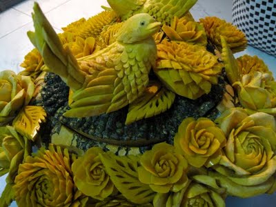 งานศิลปะดั้งเดิมของไทยนั้นมีอยู่มากมายหลายอย่างหลายแขนง การแกะสลักก็เป็นงานศิลปะอย่างหนึ่งที่ถือเป็นมรดกมีค่าที่สืบทอดกันมาช้านาน เป็นงานฝีมือที่ต้องใช้ความถนัด สมาธิ ความสามารถเฉพาะตัว และความละเอียดอ่อนมาก การแกะสลักผักและผลไม้ เป็นการแสดงออกทางวัฒนธรรมที่เป็นเอกลักษณ์ประจำของชาติไทยเลยทีเดียว ซึ่งไม่มีชาติใดสามารถเทียบเทียมได้ แต่สิ่งที่น่าเป็นห่วงที่สุดในปัจจุบันนี้คงจะเป็นเรื่องของการอนุรักษ์ ศิลปะแขนงนี้ที่มีแนวโน้มจะสูญหายไปและลดน้อยลงไปเรื่อยๆ