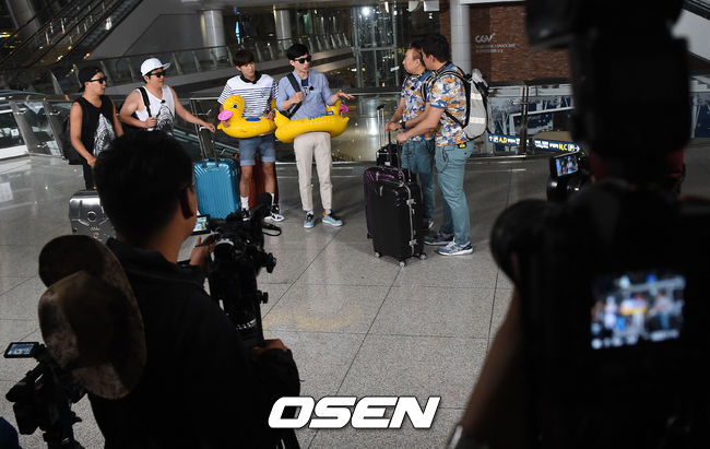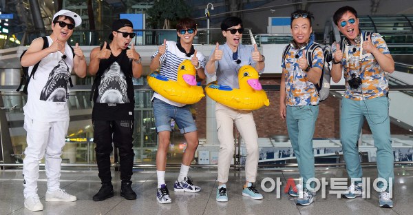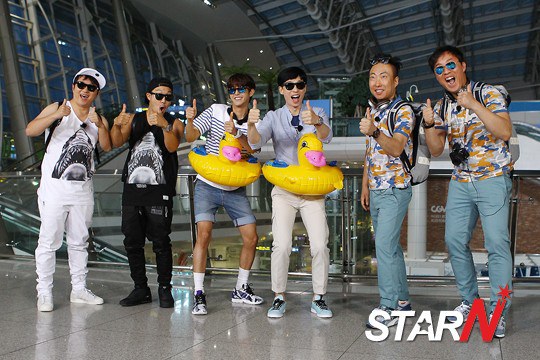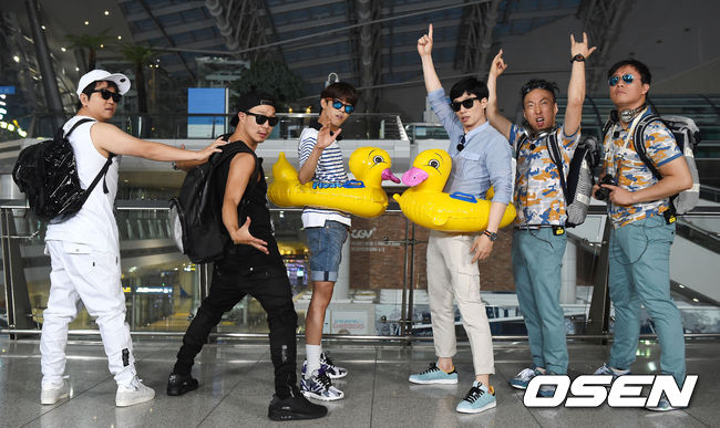 ยูแจซอก (Yoo Jae Suk) พัคมยองซู (Park Myung Soo) จองจุนฮา (Jung Joon Ha), จองฮยองดน (Jung Hyung Don), ฮ่าฮ่า (Haha) และฮวังกวังฮี (Hwang Kwang Hee) จากรายการ 'Infinity Challenge' อวดแฟชั่นสนามบิน