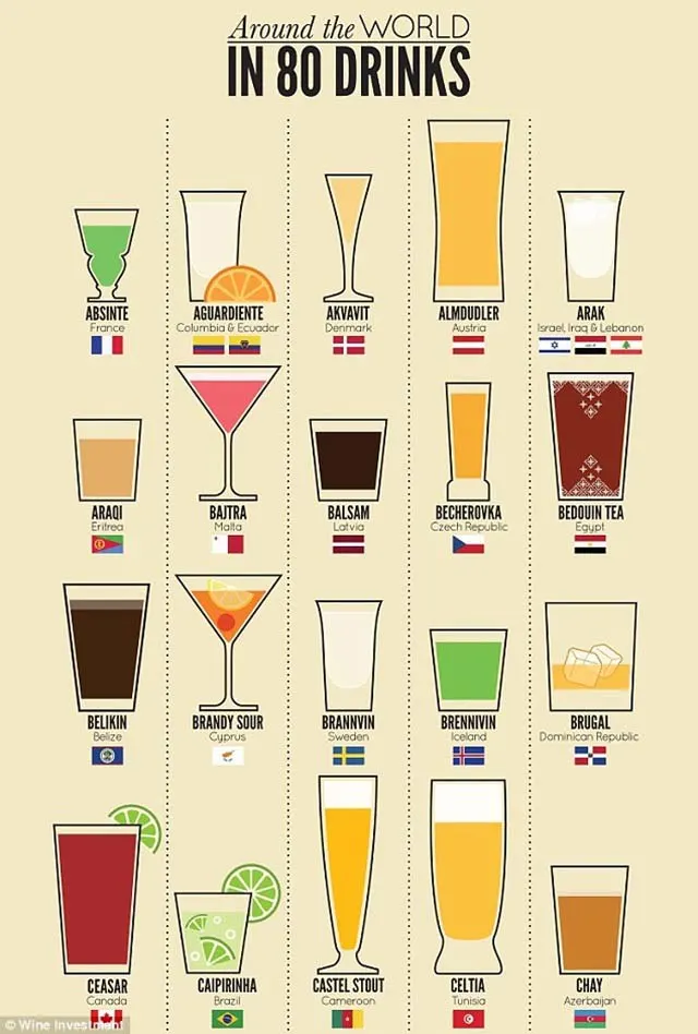 แน่นอนว่าเครื่องดื่ม โคคา โคล่า ที่ได้รับความนิยมทั่วโลกนั้นมีต้นกำเนิดมาจากสหรัฐอเมริกา ในละประเทศก็มีเครื่องดื่มขึ้นชื่อที่เป็นเอกลักษณ์ของประเทศไม่เหมือนกัน บริษัทไวน์แห่งหนึ่งจึงได้ทำอินโฟกราฟิกนี้ขึ้นมาเพื่อแสดงให้เราได้เห็น 80 เครื่องดื่มของแต่ละชาติที่มีชื่อเสียง รวบรวมมาเป็นภาพกราฟิกได้เราได้ดูกัน