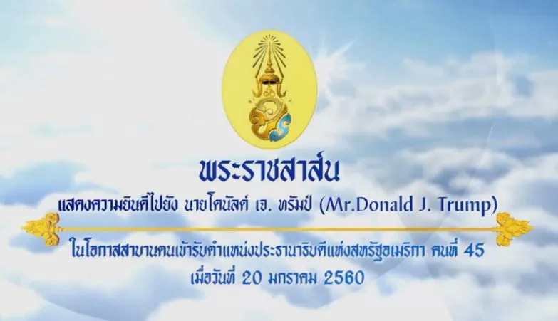 สมเด็จพระเจ้าอยู่หัว มีพระราชสาส์นแสดงความยินดีไปยังนายโดนัลด์ เจ.ทรัมป์ (Mr. Donald J.Trump) ในโอกาสสาบานตนเข้ารับตำแหน่งประธานาธิบดีแห่งสหรัฐอเมริกาคนที่ 45 เมื่อวันที่ 20 มกราคม 2560 ดังนี้