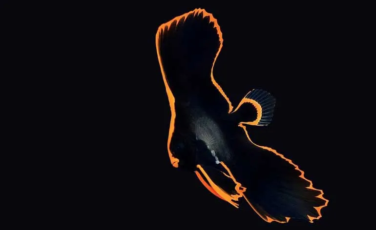 นี่คือปลาสายพันธุ์แปลก จะเรียกว่า ปลาที่สวยแปลกที่สุดในโลก ก็คงจะไม่มีใครเถียงแน่นอน มันมีฉายาว่า Firebird Fish หรือ ปลานกไฟ ด้วยรูปร่างหน้าตาที่ดูแล้วงดงามราวกับนกไฟที่กำลังโบยบินอย่างนั้นเลยครับ แต่นั้นก็เป็นเพียงแค่ฉายาเท่านั้นเพราะจริงๆ แล้วนี่คือ ปลาหูช้างครีบยาว หรือ ปลาค้างคา หนึ่งในสายพันธุ์ปลาน้ำเค็มที่โดดเด่นที่สุด เมื่อยังเป็นเด็กครีบหลังและครีบท้องยาว รอบลำตัวมีสีส้มสดใส ส่วนลำตวของมันจะเป็นสีดำสนิท ดูแล้วมีลักษณะคล้ายกับค้างคาว หรือมองไกลเหมือนกับนกที่โบกปีกโบยบินอยู่อย่างสวยงาม
