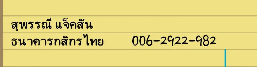 ธนาคารกสิกรไทย เลขที่ 006-2922-982 ชื่อ สุพรรณี แจ็คสัน ค่ะ