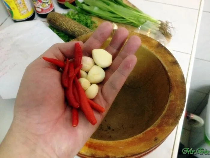 พริกแดง 9 ลูกและกระเทียม 6 กลีบ โขลกให้เข้ากันจนแหลกนะครับ จากนั้น.....