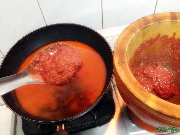 บดขยี้ทุกอย่างจนเข้ากัน จากนั้นตักใส่ในกระทะครับ ทิ้งมันเอาไว้แบบนั้นแหละครับแล้วไปเตรียมอย่างอื่นต่อ