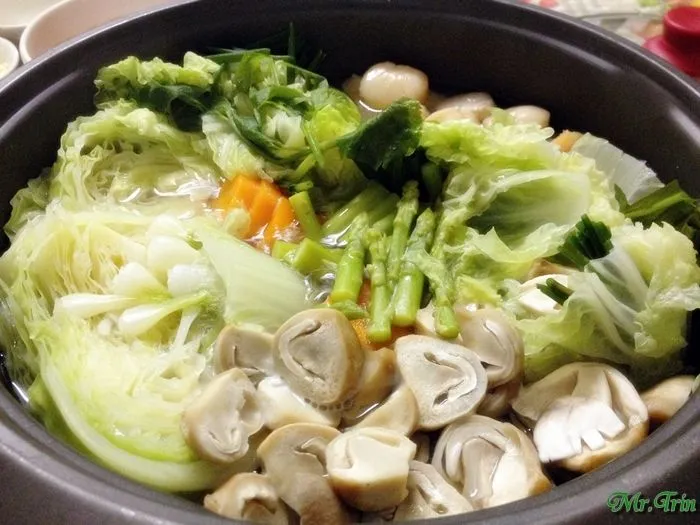 น้ำเดือดใส่ผักลงไป วันนี้มีผักกาดขาว กะหล่ำปลี ไชเท้า คึ่นช่ายและต้นหอมครับ