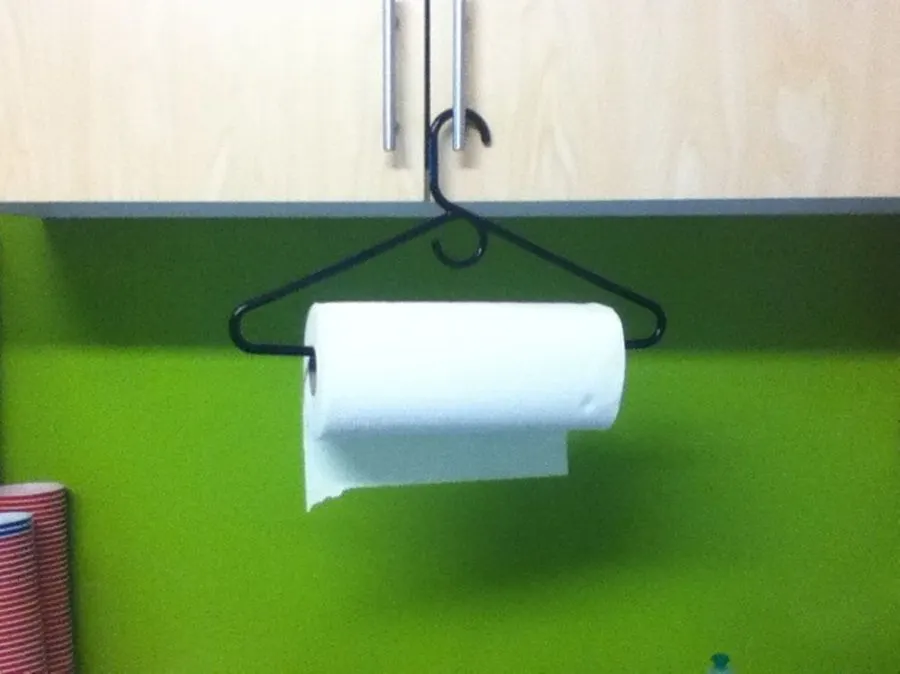 10. ใส่กระดาษทิชชู่ไว้ในไม้แขวนเสื้อเอาไว้ใช้ในห้องครัวช่วยให้หยิบได้ง่ายมากขึ้น