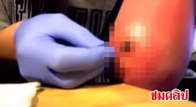 ขณะทำการเจาะแผลที่บวมเป่งสุดน่ากลัวดังกล่าวก็ปรากฎว่าช่วงแรกนั้นมีได้มีหนองไหลออกมาปนกับเลือด แต่พอเจาะลงไปเรื่อย ๆ ก็ไหลออกมาไม่หยุดจนกระทั่งต้องใช้ทิชชู่เพื่อซับออก แต่ปริมาณของเหลวที่ไหลออกมานั้นเยอะมากจนไหลนองไปทั่ว ทำให้ดูแล้วชวนน่าขนลุก