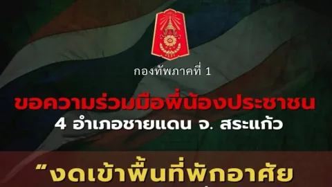ด่วน! กองทัพภาค 1 แจ้งเตือนประชาชน 4 อำเภอชายแดน ‘สระแก้ว’ งดเข้าที่พักอาศัย-ด่วน! ทภ.1 แจ้งเตือนประชาชน 4 อำเภอชายแดนสระแก้ว