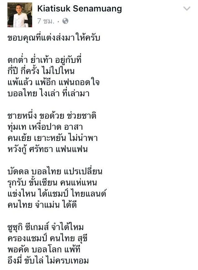 ล่าสุด (3 เมษายน 2560) ซิโก้ ได้โพสต์กลอนที่แต่งโดยแฟนคลับ ซึ่งมีเนื้อหาระบุว่า จากที่บอลไทยเคยแพ้ตกต่ำอยู่กับที่ ได้มีชายคนหนึ่งเข้ามาสู้จนพาบอลไทยคว้าแชมป์ มีแต่คนชื่นชม