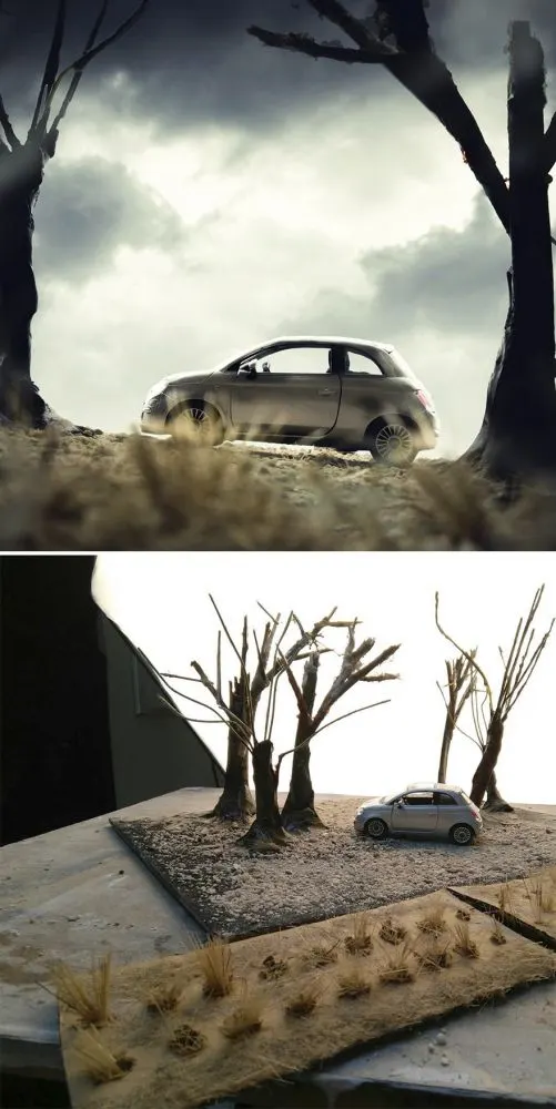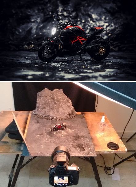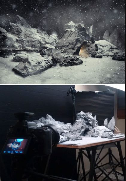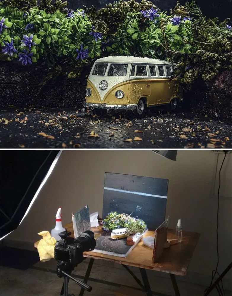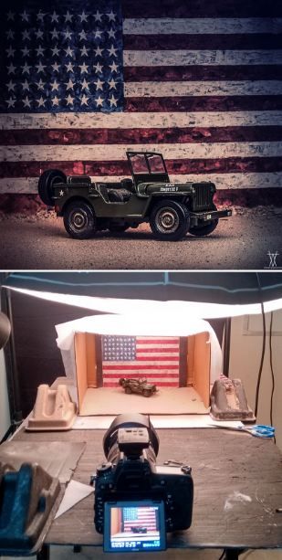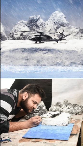 เขาไม่ได้ใช้พร็อพสำเร็จรูปที่แพงเลย เขาใช้อุปกรณ์ต่าง ๆ ให้น้อยที่สุด เขาใช้ปูนปลาสเตอร์มาทำเป็นภูเขาหรือก้อนหิน เอากระดาษเก่า ๆ มาทำรูปร่างของเนินเขา เขาใช้แผ่นโฟมและปูนปลาสเตอร์และสีดำมาทำเป็นถนน เขาใช้โฟม และแป้งทำขนมมาทำเป็นหิมะและเป็นนรูปภาพอื่น ๆ เขาใช้อุปกรณ์ที่หาได้ง่ายเพื่อให้ทุกคนทำตามได้ แล้วก็ใช้โฟโต้ช็อปตกแต่งรูป รูปเหล่านี้ทำได้ง่ายมากและน่าตื่นเต้นมาก