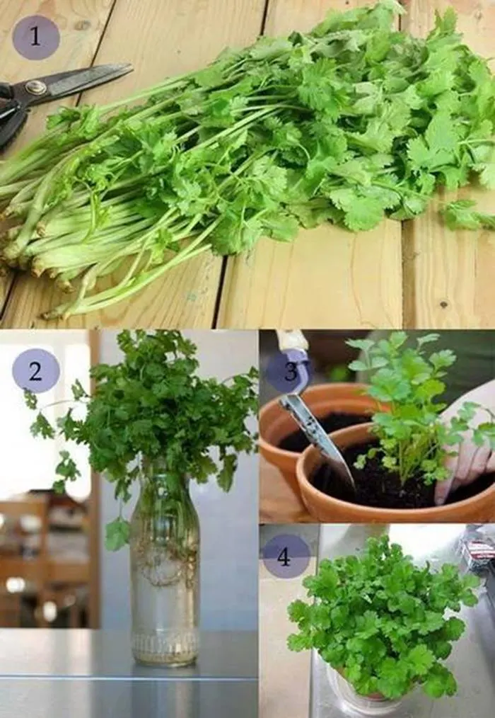 ผักชีฝรั่ง นำผักชีฝรั่งที่ซื้อมาตัดจากโคนขึ้นมาสัก 2-3 นิ้ว แช่น้ำไว้ให้ท่วมราก ใช้เวลาประมาณ 3 วัน จะมีรากใหม่งอกออกมา นำลงปลูกในกระถางได้เลย พอผ่านไป 10-12 วัน ใบที่งอกใหม่จะยาวขึ้น โดยผักชีฝรั่งจะใช้ระยะเวลาเติบโต 60-65 วัน จึงจะแก่พอสำหรับนำไปกินหรือประกอบอาหาร