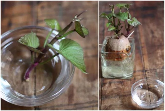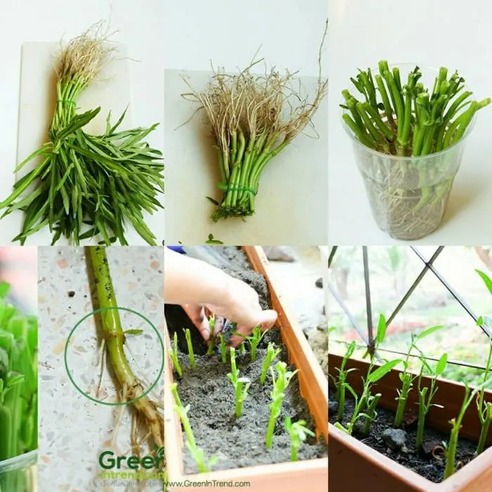 นำ ผักบุ้ง ที่ซื้อมาเป็นกำ เรียงให้รากอยู่เสมอกัน ก็ตัดตรงก้าน นับจากรากขึ้นมา 2-3 นิ้ว นำรากไปแช่น้ำไว้ 1-2 วัน ใส่ในภาชนะใสที่มองเห็นได้ เพราะเราจะสังเกตรากใหม่ที่งอกขึ้นมา เตรียมที่ปลูกด้วยการหาภาชนะเหลือใช้ในบ้าน หรือใครมีกระถางอะไรก็เอามาใช้ ใส่ดินพอสมควรก็ลงมือปลูกได้ ใช้เวลารวมทั้งหมดตั้งแต่ตัดรากแช่น้ำประมาณ 2 อาทิตย์ก็เก็บกินได้แล้ว
