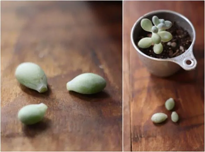 พืชอวบน้ำก็สามารถปลูกได้เช่นกัน ใช้ส่วนของใบ นำมาวางทิ้งไว้ในบริเวณที่แสงแดดอ่อนๆ ส่องถึง หลังจากนั้น 2 วันให้ย้ายมาวางบนดินเปียกน้ำหมาดๆ หมั่นพรมน้ำเบาๆ แล้วรอคอยให้ 7 สัปดาห์แรกผ่านไป คุณจะเห็นต้นอ่อนเล็กๆ งอกขึ้นมา
