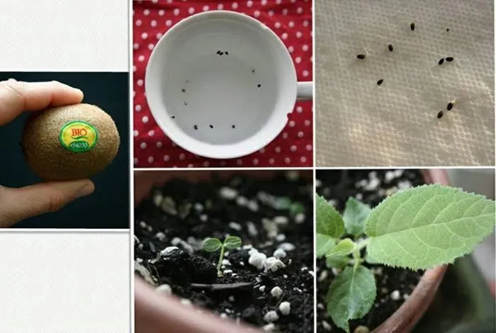 ใช้เฉพาะ กีวี ออแกนิกที่ไม่ได้ผ่านการ GMO มาเท่านั้นนะจ๊ะ ผ่าครึ่งแล้วตักเมล็ดกีวีบางส่วนออกมา โดยแยกเนื้อกีวีออกจากเมล็ดให้หมด จากนั้นนำไปแช่ในน้ำอุ่น และตากไว้บริเวณที่มีอากาศร้อน หมั่นเปลี่ยนน้ำทุกวันเพื่อป้องกันการเจริญเติบโตของแบคทีเรีย พอเมล็ดเริ่มแตกก็ย้ายไปวางบนกระดาษทิชชู่อุ้มน้ำ อย่าลืมใช้ที่ครอบพลาสติกครอบไว้ด้วยนะจ๊ะ 2 วันก็ได้ต้นอ่อนแล้ว