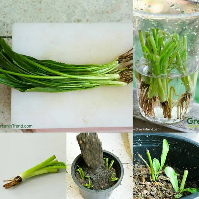 นำส่วนที่เป็นโคนของกอผักกวางตุ้งจีน แช่น้ำไว้ ประมาณ 1-2 สัปดาห์ พอผักเริ่มแตกยอดใหม่ ก็ย้ายไปปลูกในดินต่อได้เลย