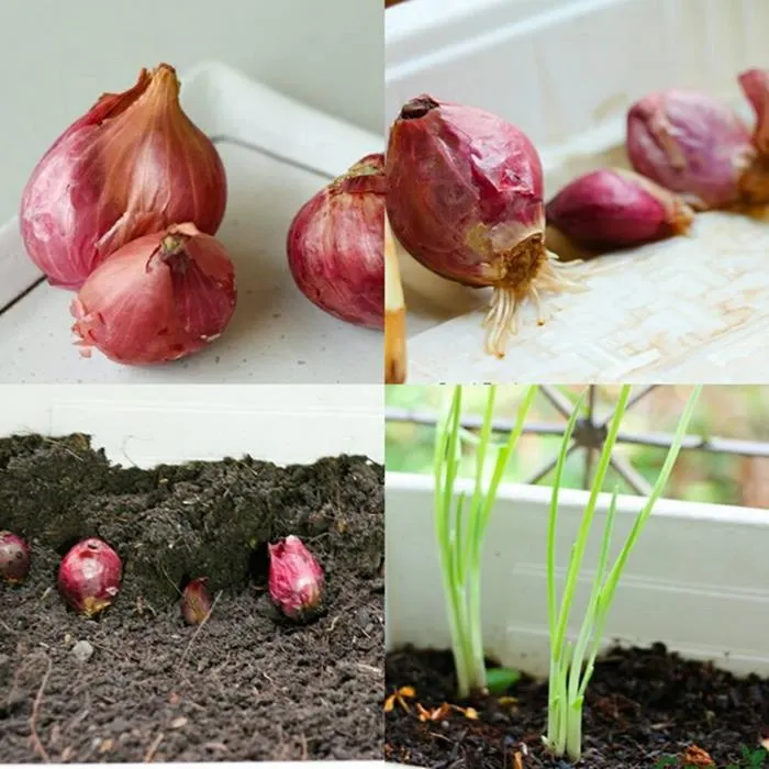 หอมแดง โดยการนำหัวหอมวางลงบนภาชนะที่ใส่น้ำไว้เล็กน้อย วางไว้ 2-3 วัน รากก็จะยาวขึ้น นำลงปลูกได้เลย หากจะให้ได้ผลดี ควรปลูกบนดินที่ขึ้นแปลงไว้ จะทำให้หอมแดงเจริญเติบโตได้ดี ผ่านไป 10 วันนับจากลงปลูก ใบจะยาว 5-7 เซนติเมตร บางหัวที่งอกช้าก็จะเพิ่งเริ่มงอก
