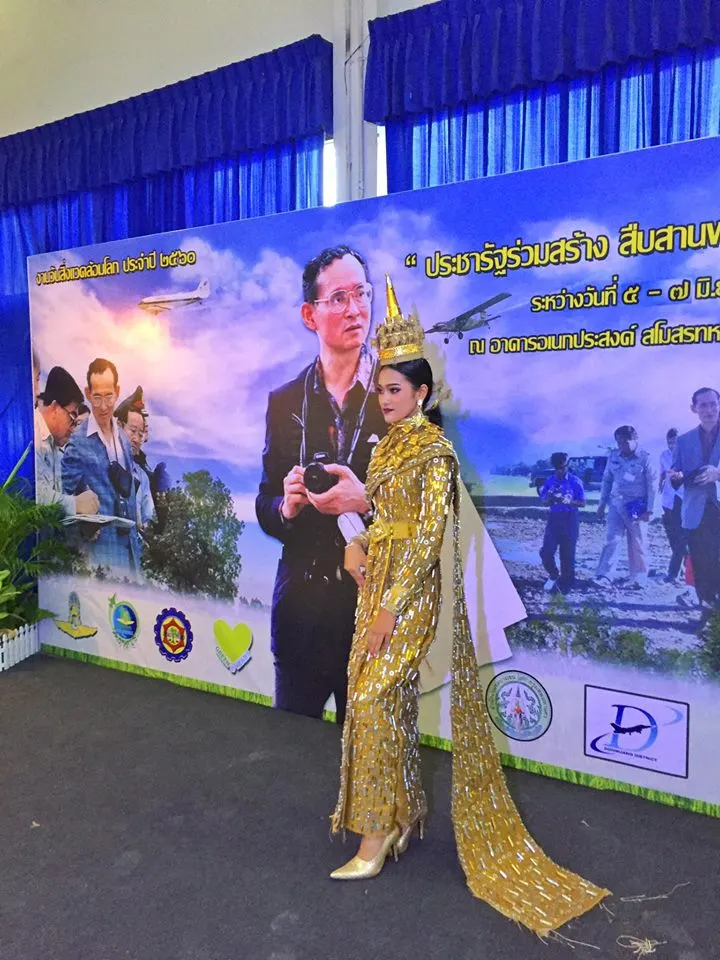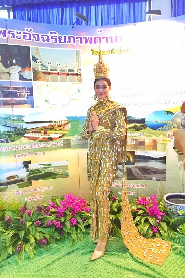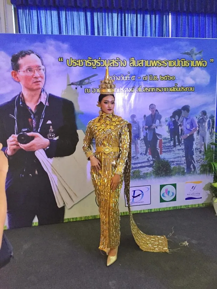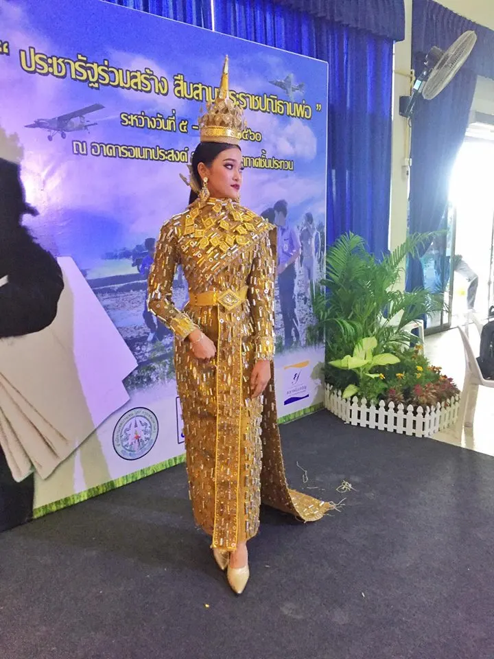 โดยผู้ใช้เฟซบุ๊คที่ชื่อ Chino Witthaya โพสท์ระบุ นี่คือชุดรีไซเคิล!! ทำจากกระสอบ และ ถุงขนม แรงบันดาลใจจากชุดประจำชาติ