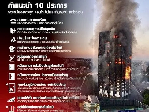ที่สำคัญ กทม.ได้กำหนด "10 มาตรการ" ป้องกันและดูแลตัวเองหากเกิดเพลิงไหม้ โดยจะขอความร่วมมือให้อาคารสูงทุกแห่งติดป้าย 10 มาตรการดังกล่าว รวมถึงอาคารขนาดใหญ่อื่นๆ ประกอบด้วย 1.สอบถามความพร้อมของอุปกรณ์ความปลอดภัยจากเหตุไฟไหม้ 2.ตรวจสอบทางหนีไฟฉุกเฉิน 3.เรียนรู้และฝึกการเดินภายในห้องพักเข้าหาประตู วางกุญแจและไฟฉายที่เตียงนอน 4.หาตำแหน่งสัญญาณเตือนไฟไหม้ 5.หนีลงจากอาคารทันที เมื่อได้ยินเสียงสัญญาณไหไหม้ 6.หนีออกมาแล้วปิดประตูห้องทันที ถ้าไฟไหม้ในห้องพักของท่าน แจ้งเจ้าหน้าที่ดูแลอาคารโดยเร็ว 7..หนีออกจากห้อง โดยวางมือบนประตู หากประตูมีความเย็นอยู่ ค่อยๆเปิดประตู แล้วหนีไปยังทางหนีไฟฉุกเฉินที่ใกล้ที่สุด 8.หากประตูมีความร้อนอย่าเปิดประตู 9.คลานให้ต่ำ หากท่านต้องเผชิญหน้ากับควันไฟ 10.อย่าใช้ลิฟท์ขณะเกิดเพลิงไหม้