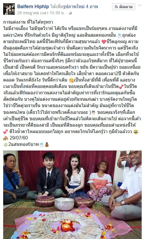 เมื่อวันที่ 29/7/2560 ที่ผ่านมา ทางเฟศบุ้คคุณ Baifern Hiphip ได้โพสเรื่องราวการแต่งงานที่เรียบง่าย ไม่ได้หรูหรา ไม่ได้มีงานเลี้ยง เหมือนๆคู่อื่นๆ ทั้ง 2 คน รักกันด้วยใจ โดยมีตามข้อความข้างล่าง
