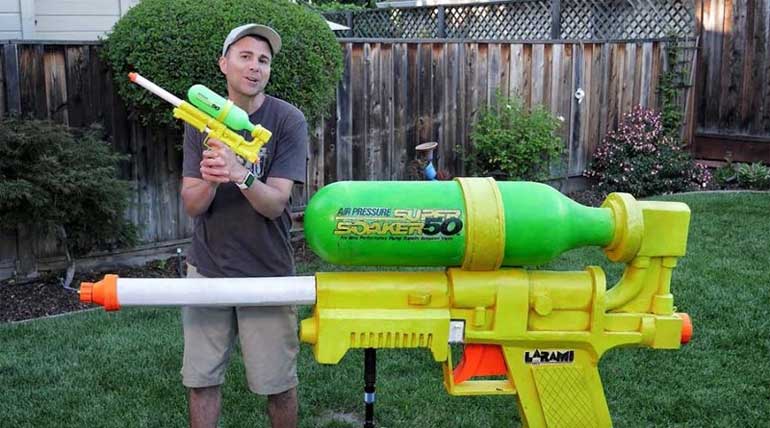 ช่วงนี้สหรัฐฯ กำลังเข้าสู่หน้าร้อน หลายๆ คนหันมาเล่น ปืนฉีดน้ำ กันแล้ว นึกถึงสงกรานต์บ้านเราเลยทีเดียว นับเป็นวิธีคลายร้อนอย่างนึ่งที่ยอดเยี่ยมแถมสนุกด้วย งานนี้เมื่อมีปืนฉีดน้ำ มันก็ต้องมีความไม่ธรรมดาออกมาด้วย ทำให้ทาง ผู้ใช้งาน YouTube ชื่อว่า Mark Rober ได้เผยแพร่คลิปปืนฉีดน้ำที่สร้างขึ้นเอง จัดว่าเป็น ปืนฉีดน้ำที่มีขนาดใหญ่ที่สุดในโลก ให้เราได้เห็นกันครับ