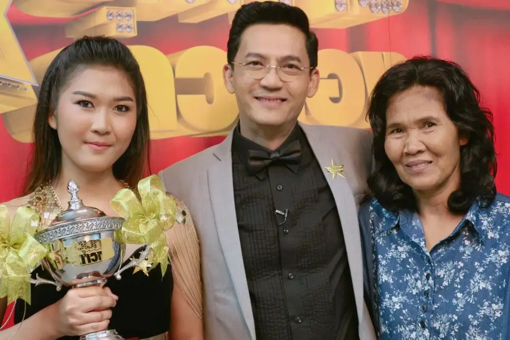 น้องปุ๊ก และ คุณแม่ ถ่ายรูปคู่กับพิธีกรรายการ นก บริพันธ์ ชัยภูมิ พร้อมถ้วยแชมป์ในมือ