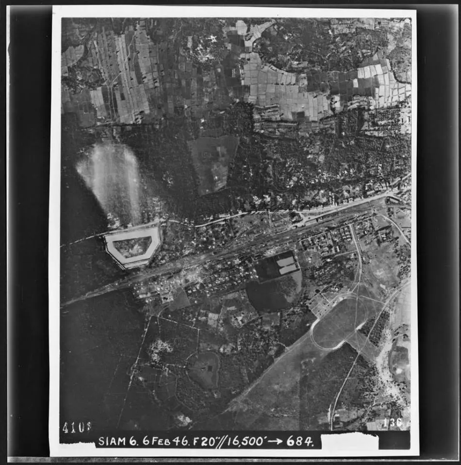 ภาพถ่ายทางอากาศ บริเวณสถานีรถไฟนครราชสีมา (หัวรถไฟ) เมื่อวันที่ 6 ก.พ. 2489 (หลังจากถูกทิ้งระเบิด 1 ปี) จะเห็นร่องรอยความเสียหายจา