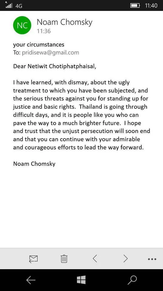 ผมได้ทราบข่าวอย่างหดหู่เกี่ยวกับการปฏิบัติอย่างน่ารังเกียจซึ่งคุณตกเป็นเหยื่อ และการคุกคามต่อคุณอย่างรุนแรง จากการที่คุณยืดหยัดเพื่อความยุติธรรมและสิทธิขั้นพื้นฐาน ประเทศไทยกำลังตกอยู่ในช่วงเวลาที่ยากลำบาก ผู้คนอย่างคุณคือคนที่จะถางทางประเทศไปสู่อนาคตที่สดใสได้ ผมหวังและเชื่อว่า การกระทำอันอยุติธรรมต่อคุณจะสิ้นสุดไปโดยเร็วที่สุด เพื่อที่คุณจะสามารถก้าวดำเนินต่อไปด้วยความพยายามอันน่าเคารพและกล้าหาญของคุณเพื่อนำประเทศให้ก้าวเดินต่อไป