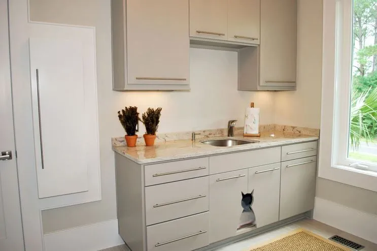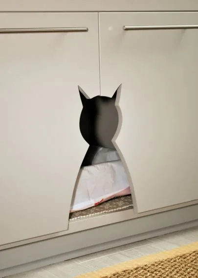 เจ้าของแมวนี้ ตัดสินใจเลือกให้พื้นที่ซักผ้าในบ้านเป็นที่วางกระบะทราย โดยวางไว้ใต้อ่างล้างมือในห้องซักผ้า และเจาะรูรูปแมวไว้อย่างดี ซึ่งพื้นที่ตรงนี้คุณก็มั่นใจได้ว่า คุณจะไม่ไปเหยียบโดนเข้า และก็เอาออกมาทำความสะอาดได้ง่ายเช่นกัน