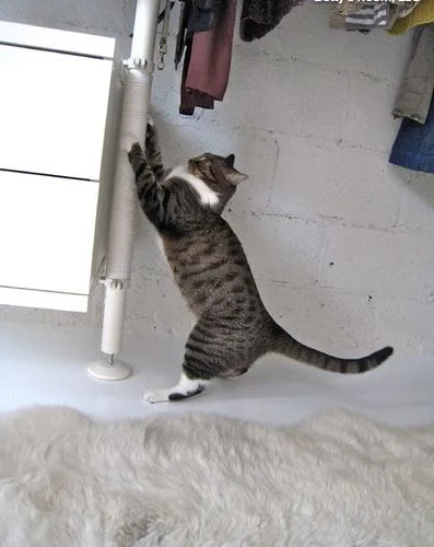 ดังนั้น อย่าลืมที่จะปิดของที่แมวอาจจะข่วนเสียหายให้ดี บางคนอาจจะหาเชือกมาพันขาวางของราวแขวนเสื้อผ้าให้น้องแมวแบบนี้ แทนคอนโดลับเล็บแมว และยังไม่เสียลุคดีไซน์ในบ้านไป ก็เจ๋งดีเหมือนกัน และถ้าคุณคิดจะเลี้ยงแมว หลีกเลี่ยงเฟอร์นิเจอร์ที่มีพื้นผิวของ ผ้าไหม ผ้าคอตตอน หรือ ผ้าลินิน ได้เลยถ้าเป็นไปได้ เพราะแมวจะข่วนเฟอร์นิเจอร์เหล่านั้น ดังนั้นพยายามที่จะเลือกใช้ ผ้ากำมะหยี่ หรือ ผ้าmicro-fiber ซึ่งแมวจะไม่สามารถลับกรงเล็บกับผ้าประเภทนี้ได้