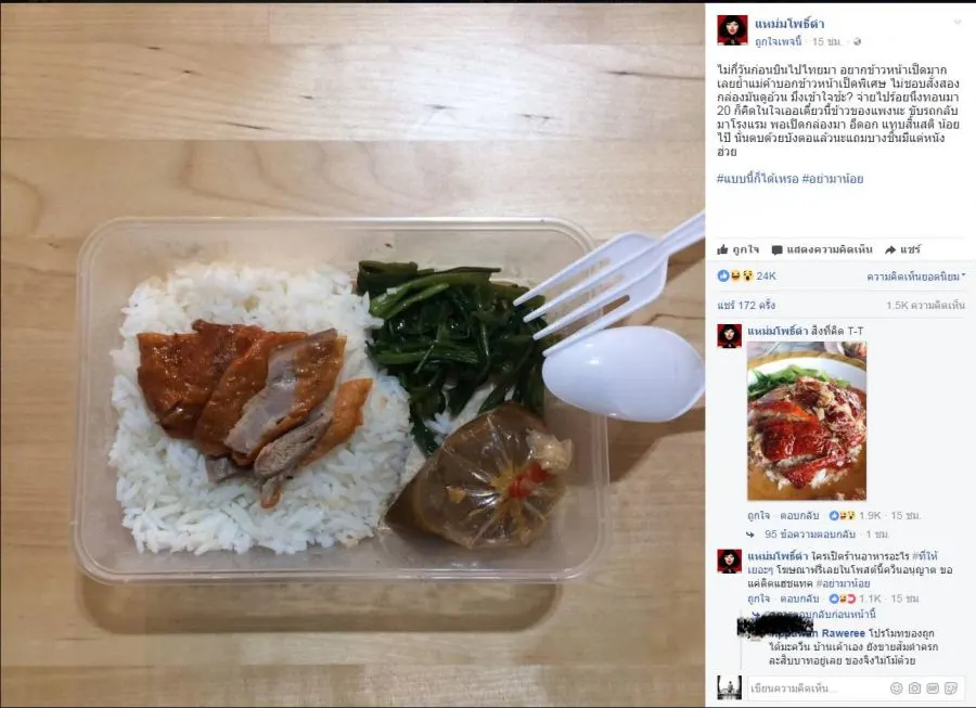 ไม่กี่วันก่อนบินไปไทยมา อยากข้าวหน้าเป็ดมาก เลยย้ำแม่ค้าบอกข้าวหน้าเป็ดพิเศษ ไม่ชอบสั่งสองกล่องมันดูอ้วน เข้าใจช้ะ? จ่ายไปร้อยนึงทอนมา 20 ก็คิดในใจเออเดี๋ยวนี้ข้าวของแพงนะ ขับรถกลับมาโรงแรม พอเปิดกล่องมา แทบสิ้นสติ น้อยไป๊ นั่นตบด้วยบังตอแล้วนะแถมบางชิ้นมีแต่หนัง ฮ่วย