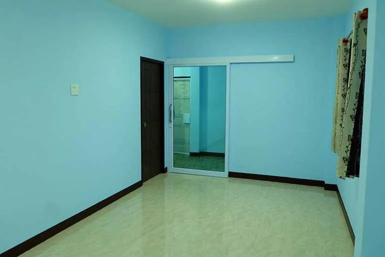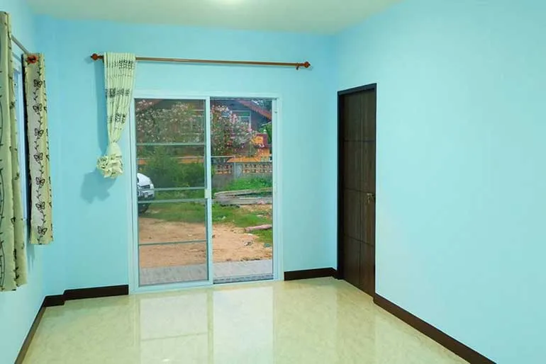 ส่วนภายในนั้นยังคงใช้สีฟ้าโทนอ่อนเป็นหลัก ใช้พื้นกระเบื้องสีครีมลายหินอ่อน เพิ่มความสะบาย ตัวบ้านเนื่องจากมีขนาดกระทัดรัดจึงถูกออกแบบให้มีขนาด 2 ห้องนอน 1 ห้องน้ำ บนพื้นที่ใช้สรอย 57 ตารางเมตร งบประมาณก่อสร้างอยู่ที่ราว 540,000 บาท หลังเล็กโมเดิร์นน่าอยู่ไม่น้อยเลยน่ะครับ ใครสนใจก็ลองเอาไปเป็นแบบไว้สร้างบ้านตัวเองกันได้เลย