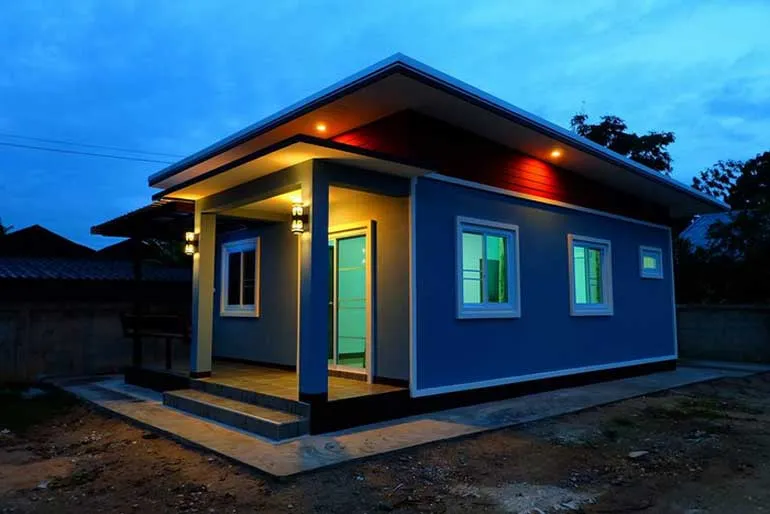 นี่คือแบบบ้านชั้นเดียวหลังน้อยนผลงานจาก PKS. Design เป็ยตัวบ้านจาก บ้านทับหมาก อำเภอเมือง จังหวัดลำปาง สีฟ้าสดใสน่าอยู่ ตัวบ้านใช้โครงสร้างหลัก ใช้หลังคาทรงเพิงหมาแหงน มีชานบ้านเพื่อการพักผ่อนด้านหน้าเล็กๆ มีการเล่นสีตัวบ้านกับขอบประตูหน้าต่างทำให้ดูมีความโมเดิร์นเล็กๆ