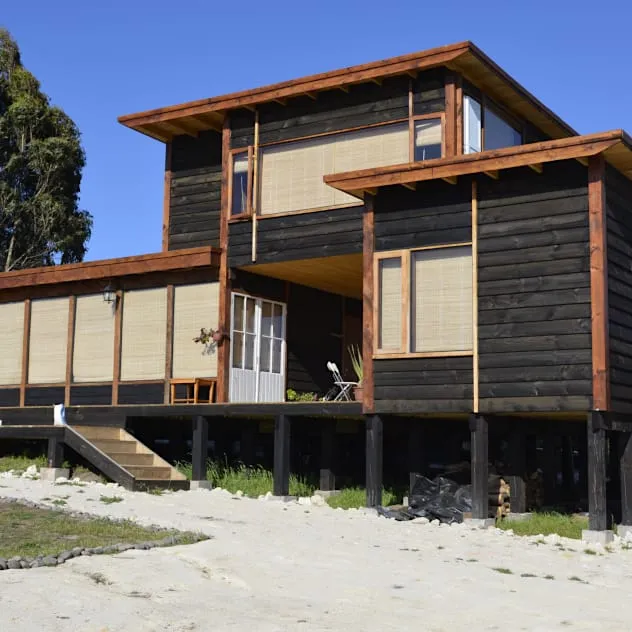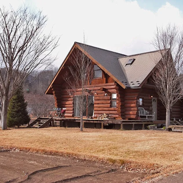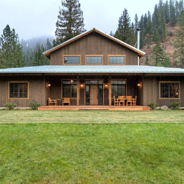 ลองนึกถึงชนบทฝรั่งป่าสนกับทุ่งหญ้ากว้างๆ นี่แหละสไตล์ของบ้านหลังนี้เลย บ้านไม้หลังนี้มีตัวบ้านกว้างใช้ไม้ธรรมชาติโทนสีเข้มดูแข็งแรงและน่าอยู่ หน้าบ้านมีเฉลียงขนาดใหญ่ที่สามารถวางได้ทั้งโต๊ะกินข้าวและมุมรับแขกเล็กๆ ทั้งสนามหญ้าสีเขียวหน้าบ้านและป่าสนแบบนี้ สดชื่นแค่ไหนถามใจดู