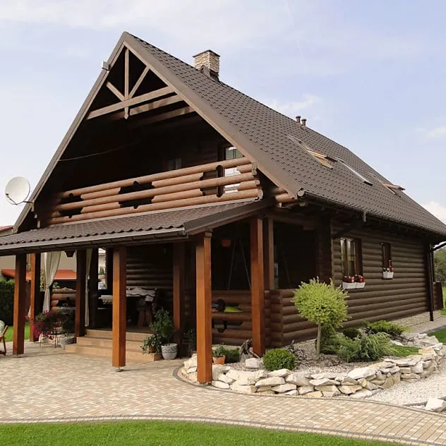 เห็นแล้วรักเลยบ้านสวยแบบนี้ เป็นบ้านไม้ที่หน้าตาดูดีเหมือนกับรีสอร์ทเลยทีเดียว ตัวบ้านทำจากไม้ซุงที่ดูสวยเป็นเอกลักษณ์ใช้สีน้ำตาลเข้มรวมทั้งหลังคาด้วยเช่นกัน มีระเบียงที่บริเวณชั้นสองโดยราวกันตกเจาะไม้ให้เป็นช่องดูสวยงาม ส่วนพื้นที่หน้าบ้านก็มีกันสาดที่รองรับน้ำหนักไว้ด้วยเสาไม้ขนาดใหญ่ ทำเป็นมุมพักผ่อนได้เลยอีกมุม