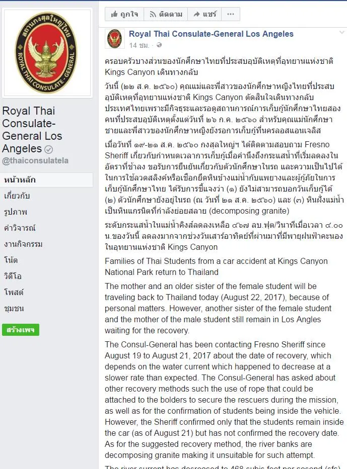 วันนี้ (๒๒ ส.ค. ๒๕๖๐) คุณแม่และพี่สาวของนักศึกษาหญิงไทยที่ประสบอุบัติเหตุที่อุทยานแห่งชาติ Kings Canyon ตัดสินใจเดินทางกลับประเทศไทยเพราะมีกิจธุระและรอดูสถานการณ์การเก็บกู้นักศึกษาไทยสองคนที่ประสบอุบัติเหตุตั้งแต่วันที่ ๒๖ ก.ค. ๒๕๖๐ สำหรับคุณแม่นักศึกษาชายและพี่สาวของนักศึกษาหญิงยังรอการเก็บกู้ที่นครลอสแอนเจลิส