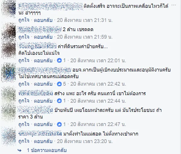 บ้างก็ว่าแพง บ้างก็ว่าผิดคำสั่ง คสช.บ้างก็ว่าไม่มีภาษไทย บ้างก็ว่าไม่เคยถามความต้องการของคนแม่สอดเลย บ้างก็ว่าอยากทราบประโยชน์ที่ใด้รับจากป้ายขนาดยักย์นี้