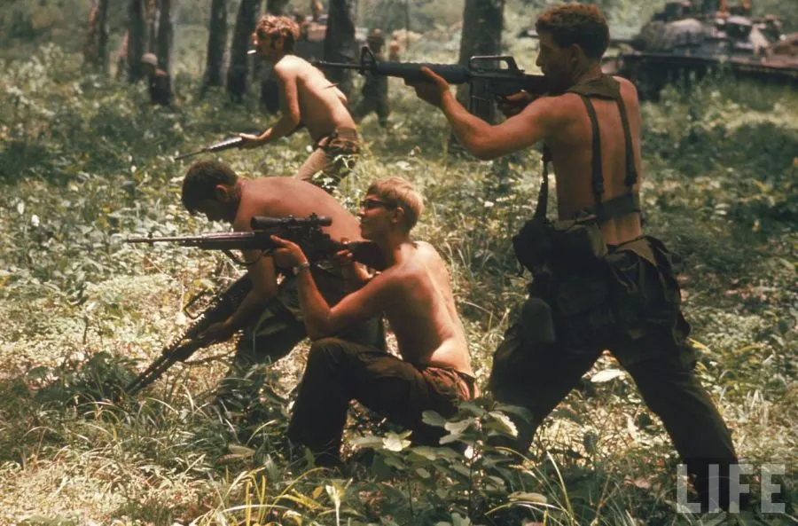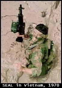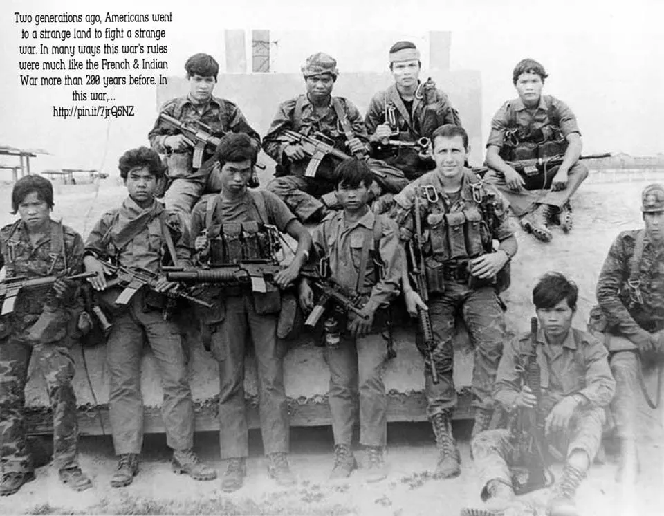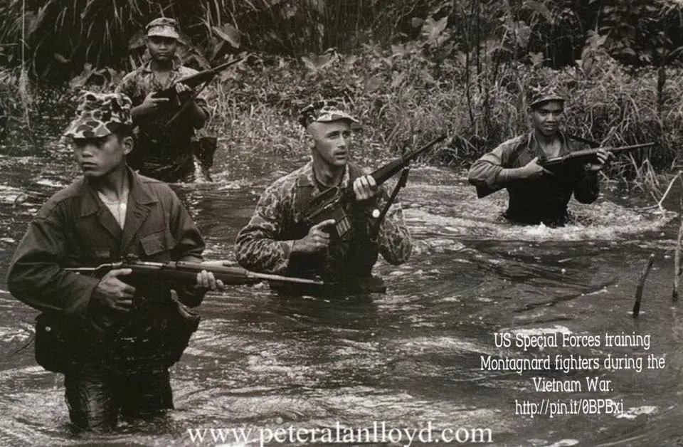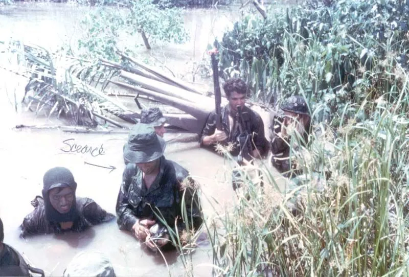 ภาพนี้น่าจะเป็นหน่วยรบพิเศษของอเมริกา เพราะชุดที่ใส่เป็นชดุพรางในขณะที่ทหารทั่วๆไปยังเป็นเขียวอยู่ เจอกับโคลนตมในป่าดิบชื้น สมบุกสมบันกันน่าดู เพราะไม่ใช่แค่การเดินป่าเที่ยวเล่น แต่อาจจะเป็นการลาดตระเวนหาข่าวในแดนของศัตรู