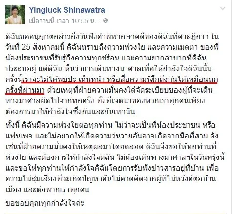 อย่างไรก็ต่ทได้มีการพูดถึงโพสท์สุดท้ายของยิ่งลักษณ์ที่โพสท์เมื่อวานนี้ เผยความนัย์ช่วงหนึ่งว่า "เราจะไม่ได้พบปะ เห็นหน้า หรือสื่อความรู้สึกถึงกันได้เหมือนทุกครั้งที่ผ่านมา" หรือนี้จะเป็นโพสท์ที่ทำกำลังบอกว่า ยิ่งลักษณณ์ได้เตรียมการวางแผนหนีออกนอกประเทศไปแล้วหรือไม่?