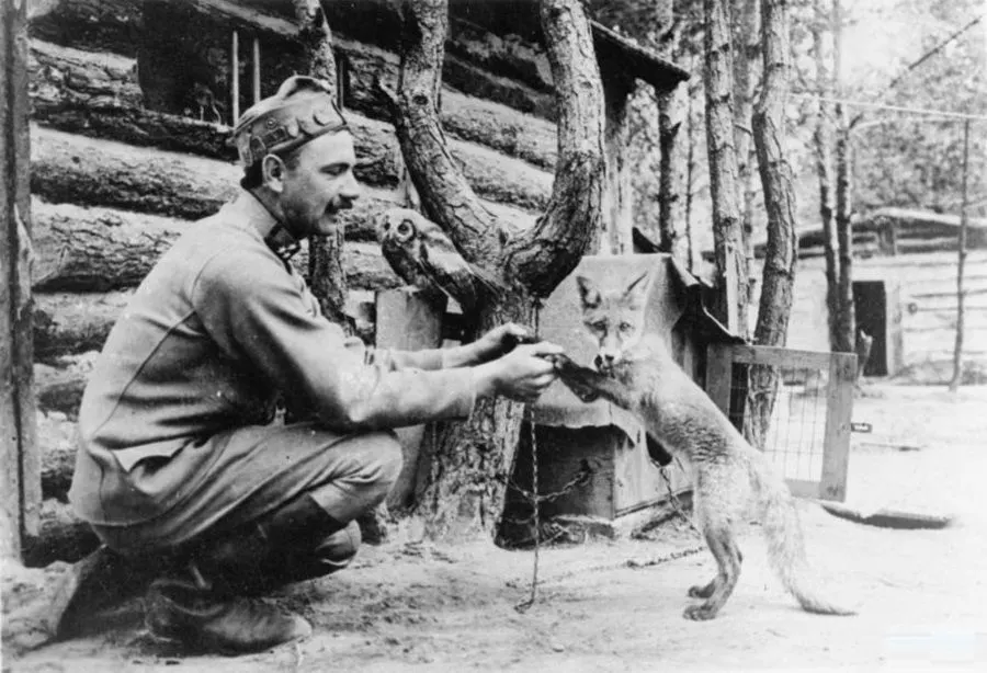 8. นักกีฬาชาวออสเตรีย - ฮังการีกำลังเล่นกับสุนัขจิ้งจอกและนกเค้าแมวที่ถูกล่ามโซ่อยู่ใกล้กับแนวรบด้านตะวันออก เมื่อปี 1915