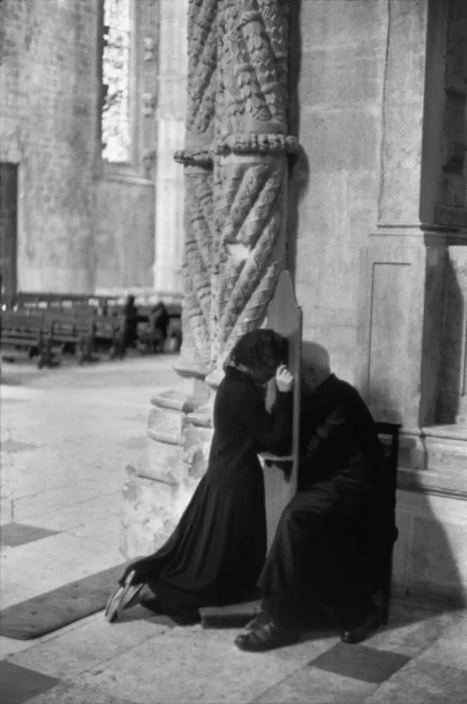10. ผู้หญิงคนหนึ่งกำลังสารภาพบาปในเมืองลิสบอน ประเทศโปรตุเกส เมื่อปี 1955