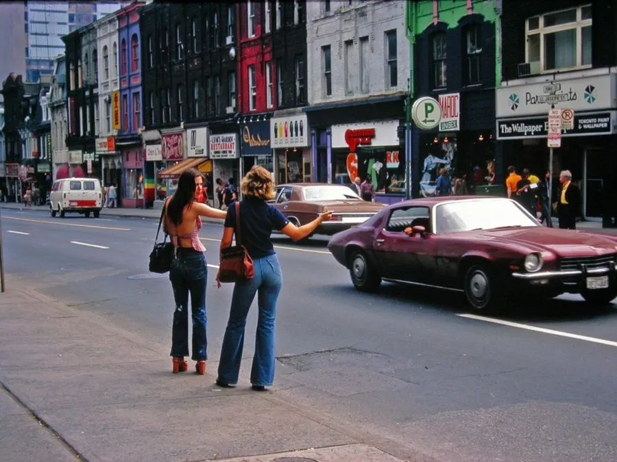 11. ผู้หญิงสองคนกำลังโบกรถประจำทางในโตรอนโตเมื่อปี 1974