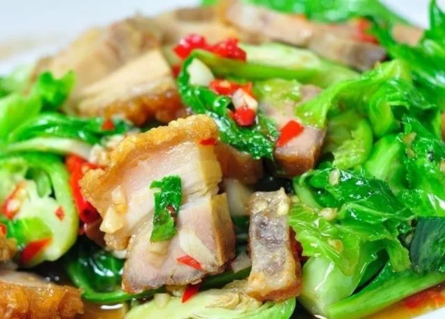 ผัดแขนงหมูกรอบ เมนูอาหารภาคกลางออกสไตล์อาหารจีนนิดๆ รสชิตของแขนงผัดนุ่มๆ บวกกับรสชาติหมูกรอบเคี้ยวกรุบๆ ตัดกับกลิ่นเต้าเจี้ยวนิดๆ เมนูนี้ถือว่าอร่อยทีเดียว