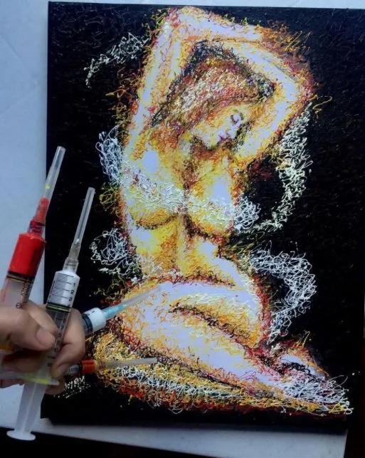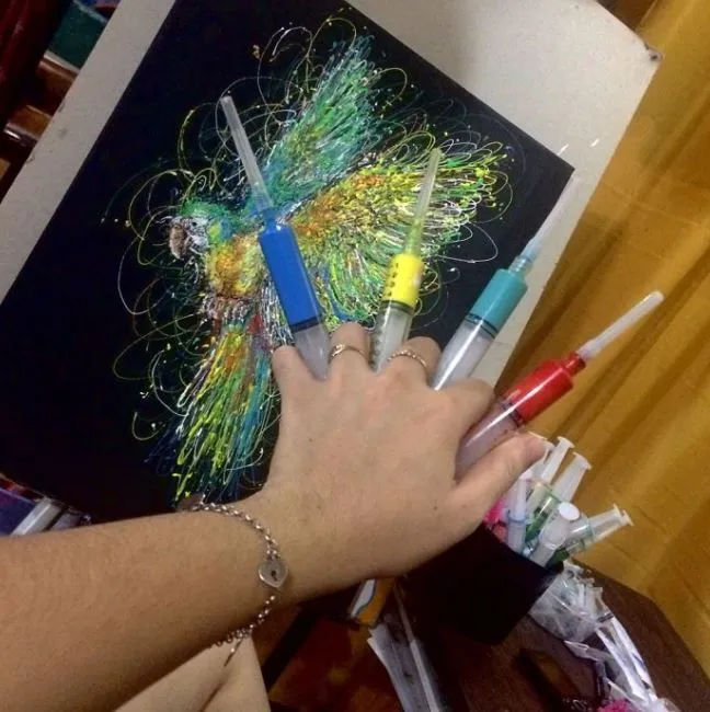 เมื่อศิลปินผู้สร้างสรรค์ภาพ Inject Art พวกนี้ เป็นฝีมือของ พยาบาลสาว ที่มี หัวใจรักศิลปะ ใช้ของใกล้ตัวที่เธอพบเห็นบ่อยๆในทุกวันนั้นก็คือ “เข็มฉีดยา” มาลงสีแทนพู่กัน ซึ่งความคิดที่นำเข็มฉีดยามาสร้างสรรค์ผลงานนั้น เธอบอกว่าคิดได้ตอนเธอกำลังให้ยากับผู้ป่วย เธอลองคิดว่าถ้าได้เติมสีสันลงไปในหลอดเข็มฉีดยาแทนละจะเป็นยังไง มันคงจะดีไม่น้อย จนในที่สุดก็กลายเป็นงานศิลปะที่เธอมักจะทำในยามว่าง ก่อนเข้างาน โอ้วโห เก่งมาก ถ้าไม่มีหัวใจรักศิลปะ จริงๆทำไม่ได้นะเนี่ย น่านับถือจริงเลย แล้วก็ใช้เวลาว่างให้เป็นประโยชน์อีกด้วย เพื่อนๆลองดูนะค่ะอาจจะเอาไปลองทำหรือลองคิดอะไรใหม่ๆที่ตัวเองถนัดดู ผลงานของเพื่อนๆอาจจะปังในชั่วข้ามคืน