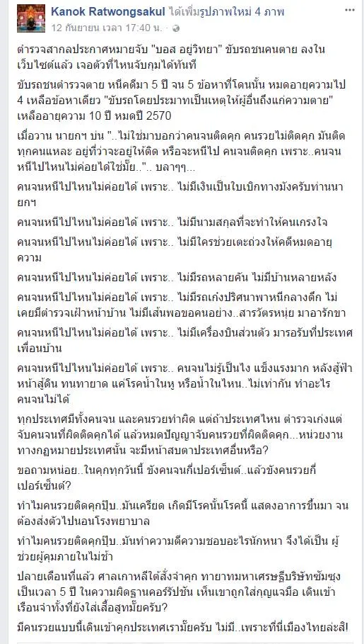 เมื่อวันที่ 12/9/2560 ทางเฟซบุ้คกนกได้ออกมาแสงความเห็น ของกรณี การตามล่าตัว นาย บอส อยู่วิทยา ผู้ต้องหาในคดีขับรถชน ตำรวจเสียชีวิต ตามรายละเอียดด้านล่าง
