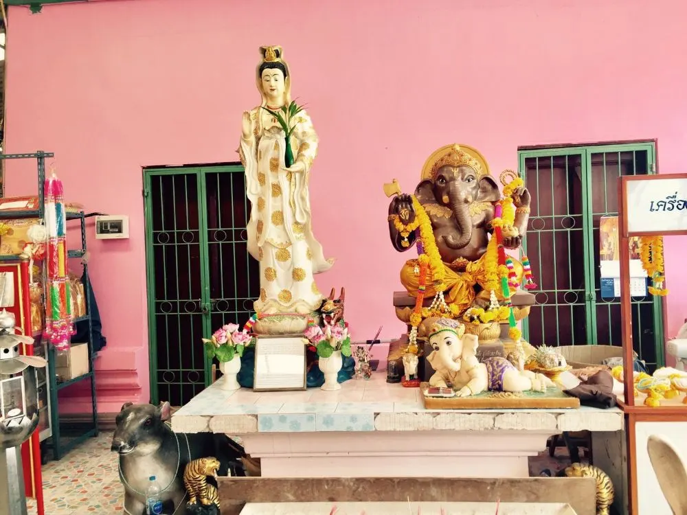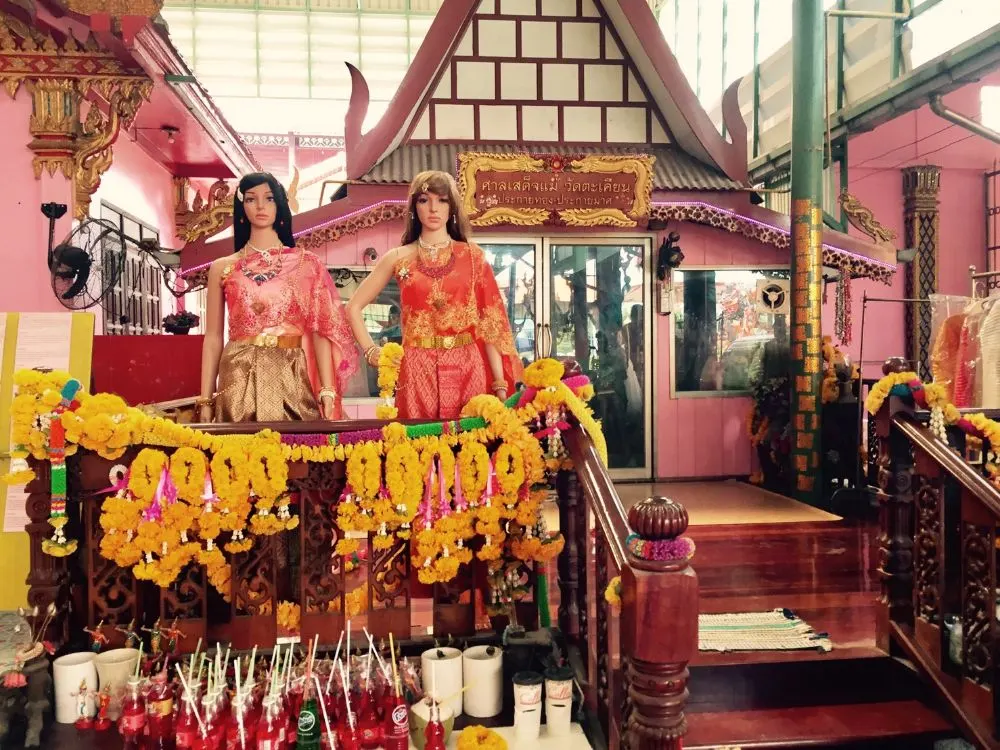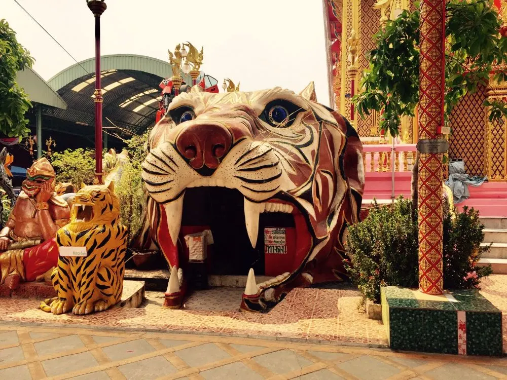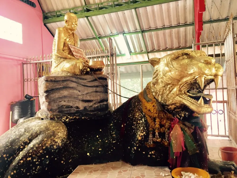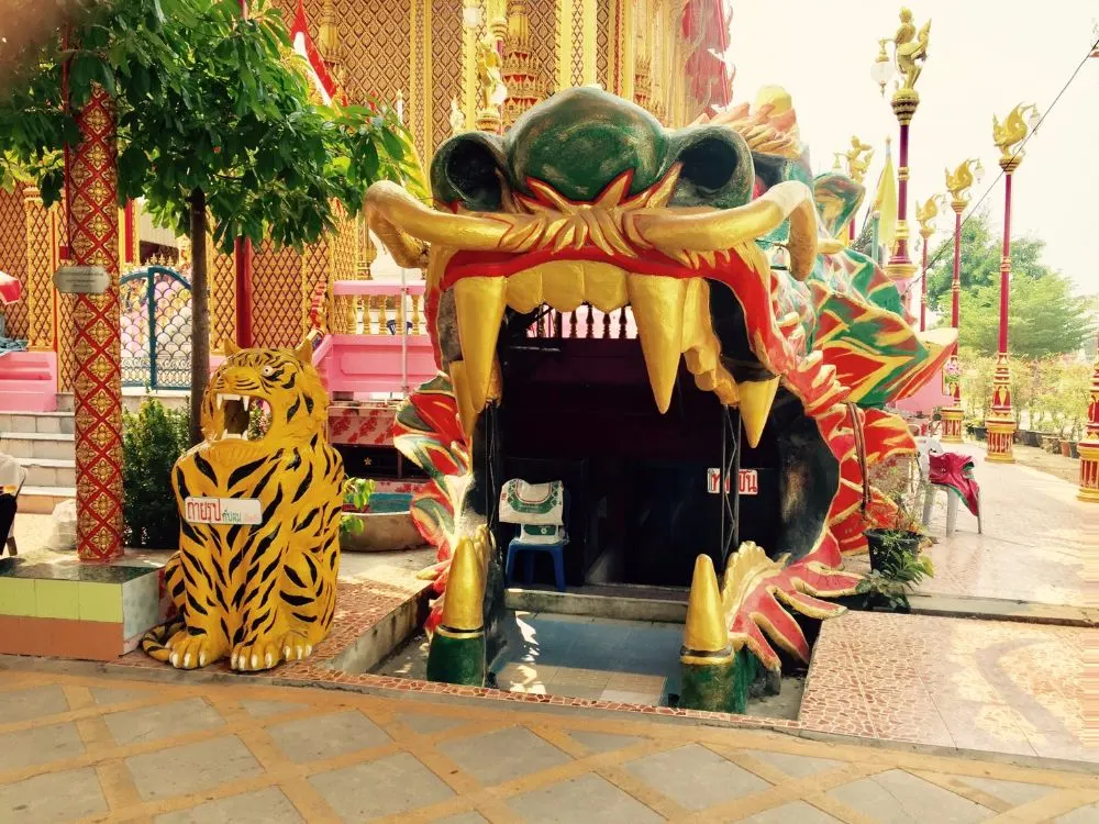 เช่นลอดใต้พระอุโบสถเข้าทางปากเสือแล้วไปออกปากมังกรเสร็จแล้วไปบูชาหลวงปู่แย้มขี่บนหลังเสือเนื่องท่านเป็นพระวิปัสสนากรรมฐานฝึกจิตรู้อดีตเห็นอนาคตและเป็นพระเกจิอาจารย์มีเมตตาธรรมต่อสัตว์โลก หลวงปู่แย้มท่านมรณภาพไปแล้วแต่สังขารไม่เน่าทางวัดตะเคียนได้อัญเชิญประดิษฐานอยู่ในโลงแก้วและทุกวันจะมีชาวบ้านมากราบไหว้ขอพรกันมากสำหรับการเดินทางไปเที่ยวตลาดน้ำวัดตะเคียน อ.บางกรวย จ.นนทบุรี