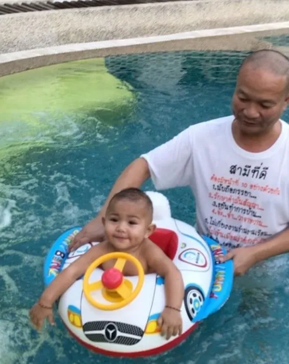 ไหนๆ ลูกสาวๆ เอ็ม บุษราคัม กำลังตั้งครรภ์ แล้ววันนี้ ตาหม่ำ & คุณยายมด เลยขอซ้อมเลี้ยงหลานไปพลางๆ ก่อน โดยล่าสุดได้พาน้องเก้ามาว่ายน้ำ คลายร้อน น่ารักๆ แบบนี้