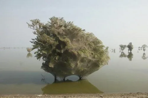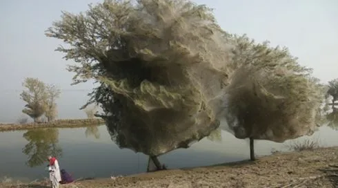 หลายๆคนคงจะเคยเห็นแมงมุมชักใยทำรัง แต่เชื่อแน่ๆว่าเกือบทุกคนยังไม่เคยเห็นรังแมงมุมที่ใหญ่ขนาดนี้มาก่อนเมื่อแมงมุมเป็นพันๆตัวได้ยึดต้นไม้ในที่โล่งแจ้งทำรังของพวกมัน จึงเกิดเป็นภาพแปลกตาขึ้น โดยสถานที่ดังกล่าวอยู่ในปากีสถาน ที่นั่นถือเป็นเรื่องปกติ เพราะมีต้นไม้หลายๆต้นที่มี แมงมุม ยึดไปทำรังของพวกมัน