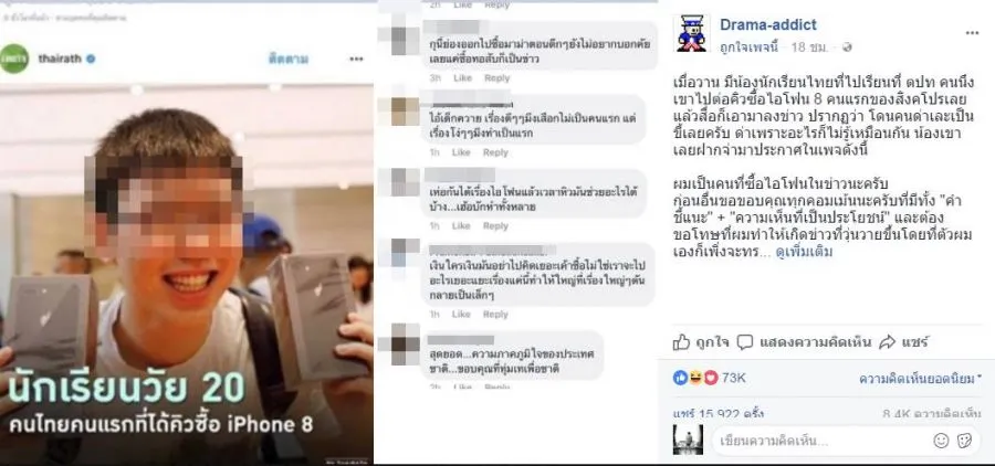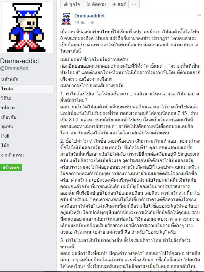เมื่อวานก่อน ทางเพจดังอย่าง drama addict ได้โพสต์คำชี้แจงเด็กไทยคนแรกที่ได้ซื้อ iphone8 ในสิงคโปร์ .. ซึ่งกลายเป็นกระแสวิจาร์ณกันอย่างหนักในโลกโซเชียล ว่า ต่อคิวนานไหม ทำไมไมเอาเวลาไปทำอย่างอื่น เงินของใคร อะไรทำนองนี้