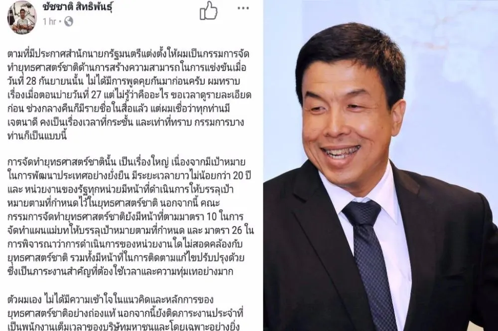 ตามที่มีประกาศสำนักนายกรัฐมนตรีแต่งตั้งให้ผมเป็นกรรมการจัดทำยุทธศาสตร์ชาติด้านการสร้างความสามารถในการแข่งขันเมื่อวันที่ 28 กันยายนนั้น ไม่ได้มีการพูดคุยกันมาก่อนครับ ผมทราบเรื่องเมื่อตอนบ่ายวันที่ 27 แต่ไม่รู้ว่าคืออะไร ขอเวลาดูรายละเอียดก่อน ช่วงกลางคืนก็มีรายชื่อในสื่อแล้ว แต่ผมเชื่อว่าทุกท่านมีเจตนาดี คงเป็นเรื่องเวลาที่กระชั้น และเท่าที่ทราบ กรรมการบางท่านก็เป็นแบบนี้